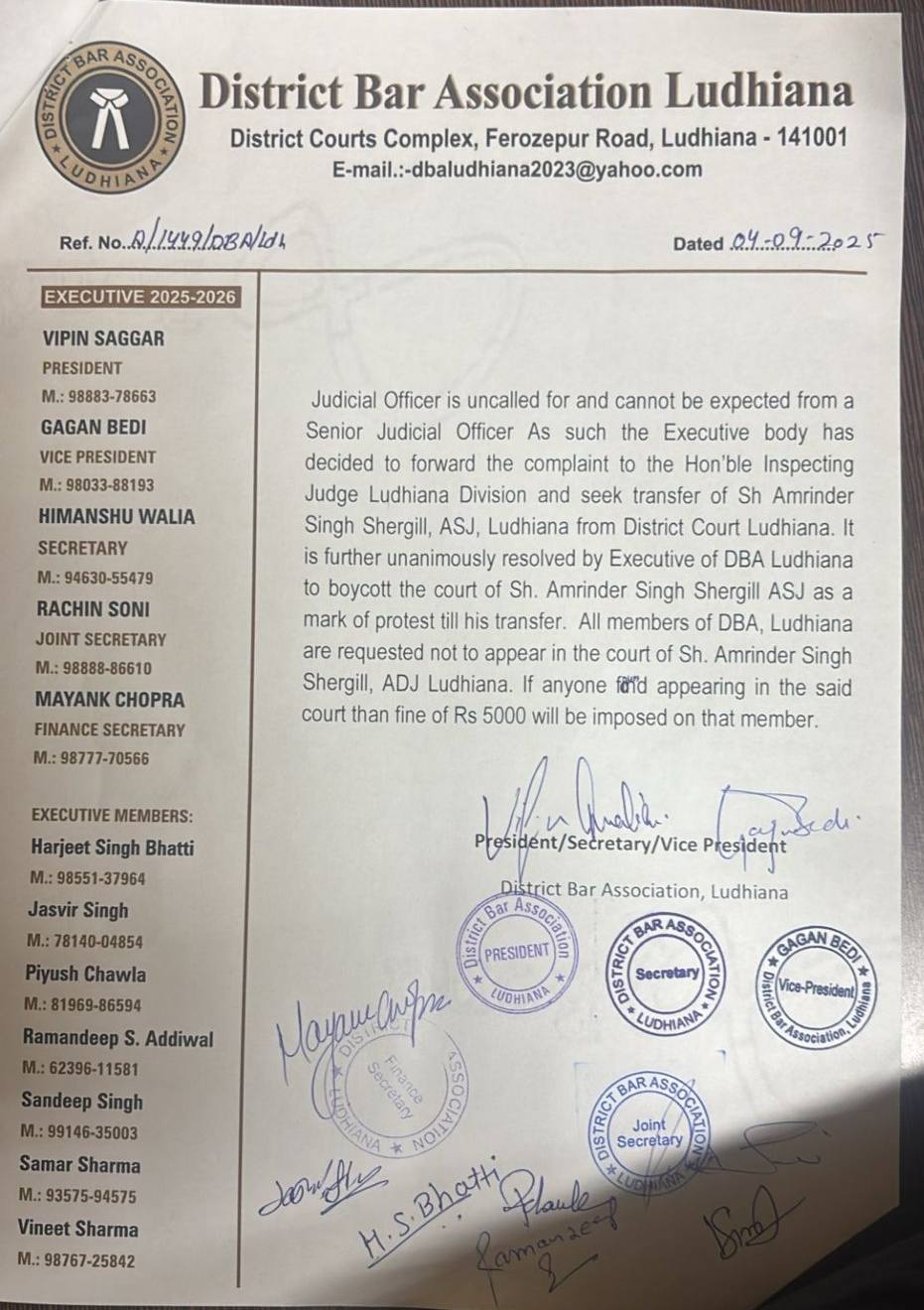 LivePunjabiਅੰਤਰਰਾਸ਼ਟਰੀਅਦਾਲਤੀ ਖਬਰਾਂਪੰਜਾਬ DBA, Ludhiana announced to boycott the court of A. S. Shergill for his rude behaviour n unworthy remarks against Legal fraternity By Sell Aid News - September 6, 2025 20 FacebookWhatsAppTelegramTwitterPinterestCopy URL Sell-aid News: . Despite various opportunities, this Judge has not mend his ways. Circular forwarded by Adv Ravinder Singh Prince.