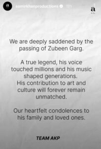 ਆਮਿਰ ਖਾਨ ਨੇ ਜ਼ੁਬੀਨ ਨੂੰ ਦਿੱਤੀ ਸ਼ਰਧਾਂਜਲੀ: ਆਮਿਰ ਖਾਨ ਨੇ ਆਪਣੀ ਪ੍ਰੋਡਕਸ਼ਨ ਕੰਪਨੀ, ਆਮਿਰ ਖਾਨ ਪ੍ਰੋਡਕਸ਼ਨ ‘ਤੇ ਇੱਕ ਪੋਸਟ ਸਾਂਝੀ ਕੀਤੀ, ਜਿਸ ਵਿੱਚ ਜ਼ੁਬੀਨ ਨੂੰ ਸ਼ਰਧਾਂਜਲੀ ਦਿੱਤੀ ਗਈ। ਪੋਸਟ ਵਿੱਚ ਕਿਹਾ ਗਿਆ ਹੈ, “ਜ਼ੁਬੀਨ ਗਰਗ ਦੇ ਦੇਹਾਂਤ ਤੋਂ ਸਾਨੂੰ ਬਹੁਤ ਦੁੱਖ ਹੋਇਆ ਹੈ। ਉਹ ਇੱਕ ਮਹਾਨ ਕਲਾਕਾਰ ਸੀ, ਉਸਦੀ ਆਵਾਜ਼ ਲੱਖਾਂ ਲੋਕਾਂ ਨੂੰ ਛੂਹ ਗਈ, ਅਤੇ ਉਸਦੇ ਸੰਗੀਤ ਨੇ ਪੀੜ੍ਹੀਆਂ ਨੂੰ ਪ੍ਰਭਾਵਿਤ ਕੀਤਾ ਹੈ। ਕਲਾ ਅਤੇ ਸੱਭਿਆਚਾਰ ਵਿੱਚ ਉਸਦੇ ਯੋਗਦਾਨ ਹਮੇਸ਼ਾ ਬੇਮਿਸਾਲ ਰਹਿਣਗੇ। ਅਸੀਂ ਉਸਦੇ ਪਰਿਵਾਰ ਅਤੇ ਅਜ਼ੀਜ਼ਾਂ ਪ੍ਰਤੀ ਆਪਣੀ ਡੂੰਘੀ ਸੰਵੇਦਨਾ ਪ੍ਰਗਟ ਕਰਦੇ ਹਾਂ। ਟੀਮ ਏਕੇਪੀ।”